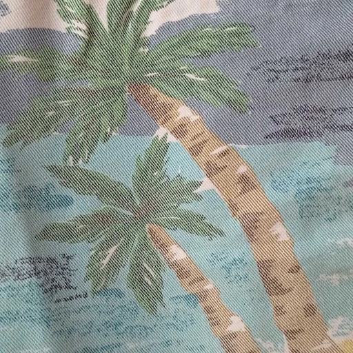 Bermuda en jean imprimé tropical aux couleurs pastel.