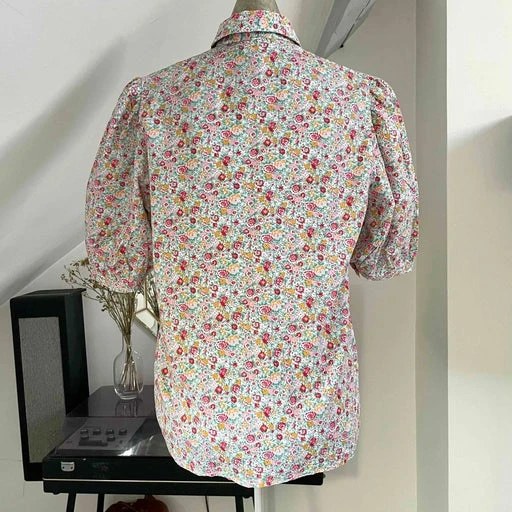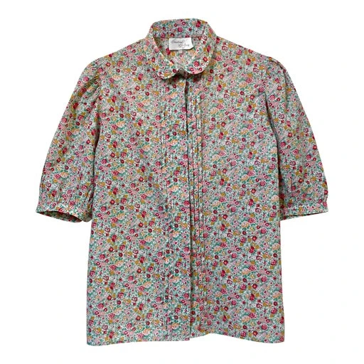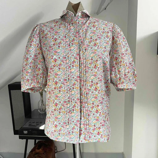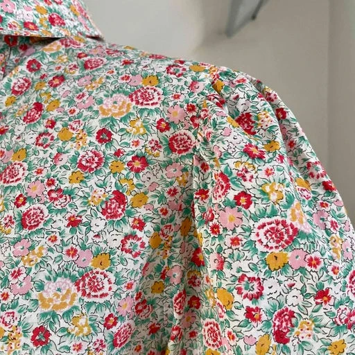 Blouse à fleurs. Coupe droite. Fronces aux épaules, manches ballons. Col Claudine, boutonnière masquée avec plis plats. Motifs fleuris Liberty. Pièces des années 80/90, 100% coton.