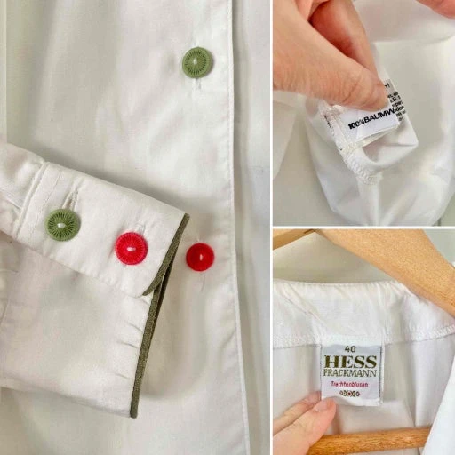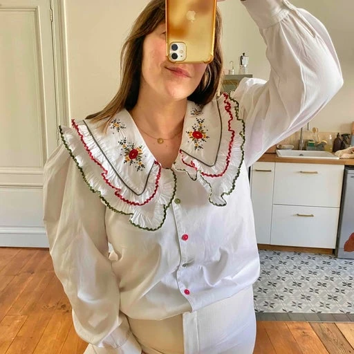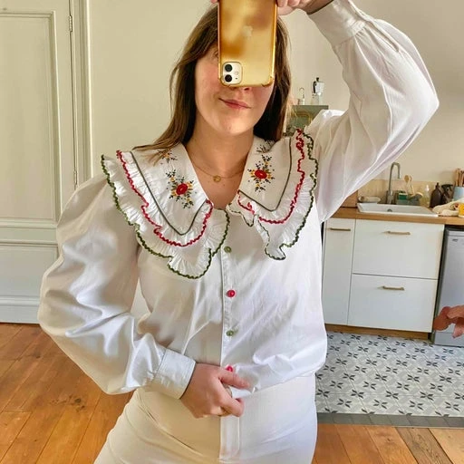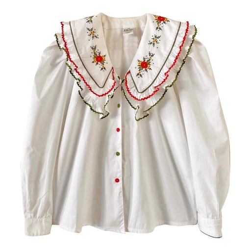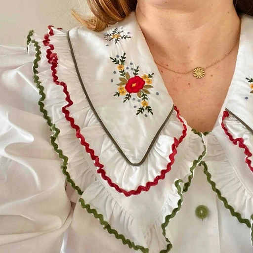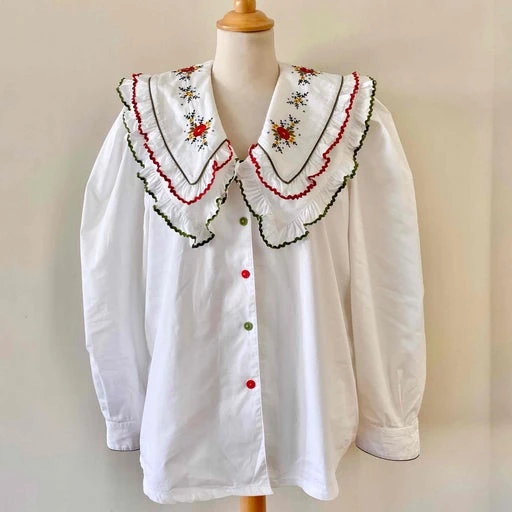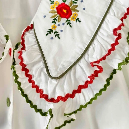 Blouse Autrichienne en 100% coton, grand col brodé de fleurs rouges, vertes, jaunes et bleutés à triples volants bordés de dentelle rouges et vertes, manches ballons, boutons brodés rouges et verts, fabriqué en Autriche, taille 38 et 40 portée ici sur un mannequin T36 et sur une personne T40.