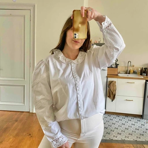 Blouse Autrichienne en 100% coton blanc, col ruffle en dentelle crochet, manches ballons gigots brodées de dentelles et rubans, boutons brodés, fabriquée en Autriche, deadstock avec étiquette d’origine, taille 40 portée ici sur une personne T40.