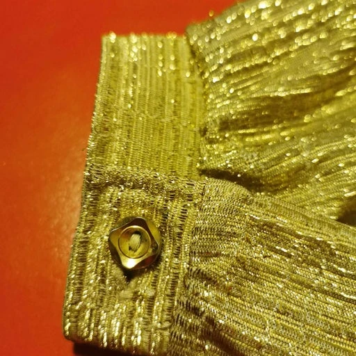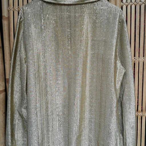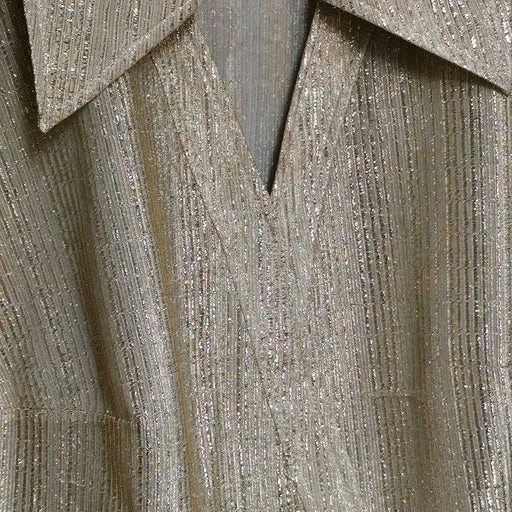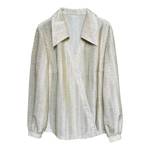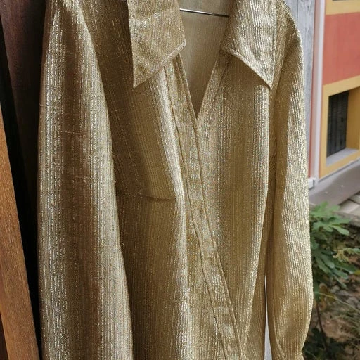 Blouse en lurex or à grand col pointu croisée et cousue en biais devant.