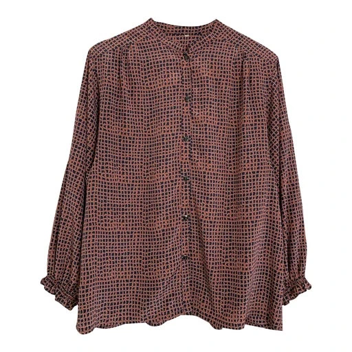 Blouse en satin, à motifs, en jacquard, petit col haut, fermée par des boutons bijoux, manches longues resserrées aux poignets avec petit volant, fronces aux empiècements épaules.