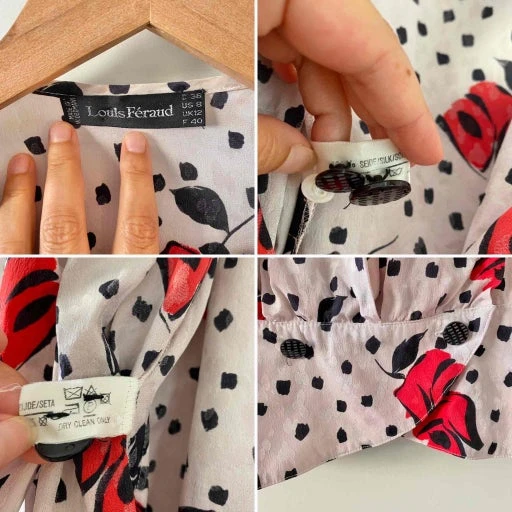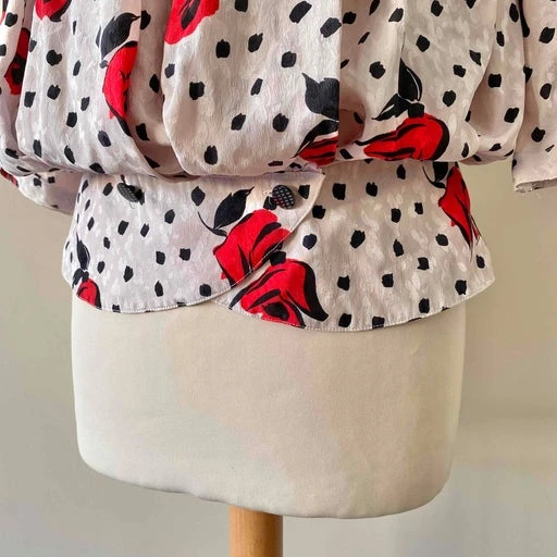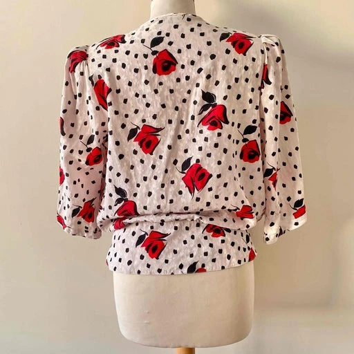 Blouse en soie Louis Féraud en plumetis de soie écrue imprimée roses rouges et pous graphiques noirs, forme croisée cache-coeur à boutonner, manches ballons 3/4, épaulettes fines, taille à basque ceintrée haute, années 80’s, fabriquée en West Germany, taille 36 portée ici sur un mannequin T36.