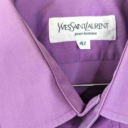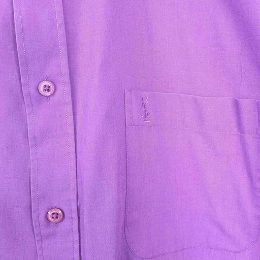 Chemise lilas Yves Saint Laurent. Poche poitrine avec monogramme brodé. Manches courtes. Coton léger. Se porte oversize à partir du 38. Portée ici en 38. Issu de la collection homme.
