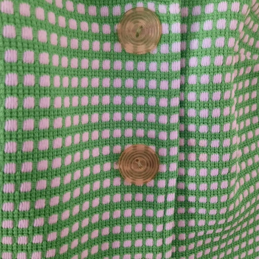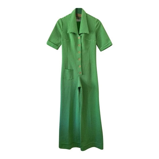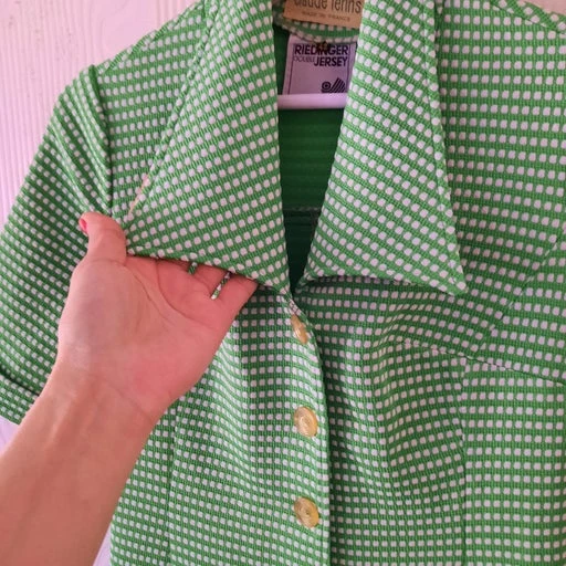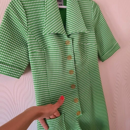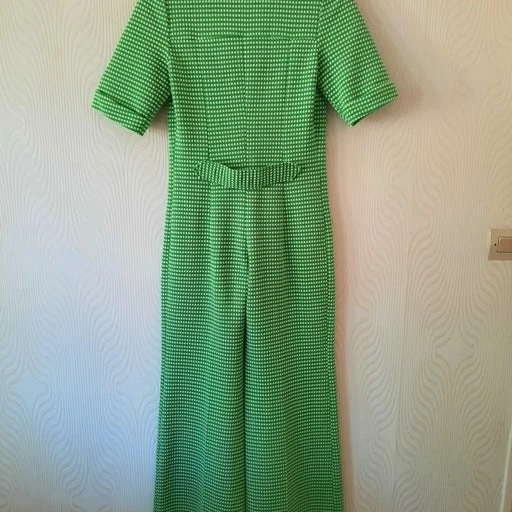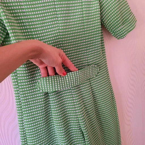 Combinaison col pelle à tarte à motif graphique, 70s. Col pelle à tarte et petit décolleté. Fermée par 6 gros boutons jaune transparent. Une poche devant. Martingale au dos. Imprimé carrés blancs sur fond vert pomme. Jersey de polyester. Made in France 70s. Mesure complémentaire : poitrine 45 cm/Longueur totale 150 cm.