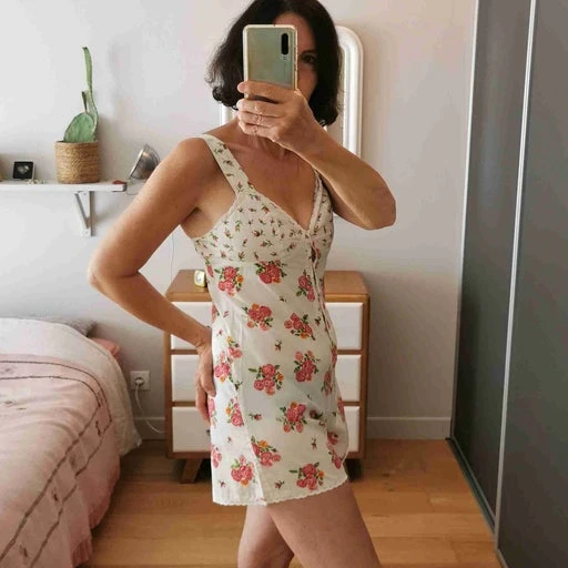 Forme balconnet avec petits boutons roses devant jusqu’à la taille.