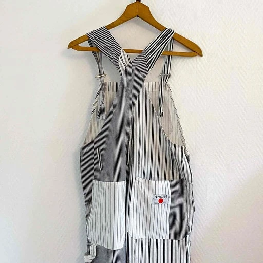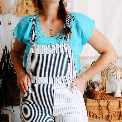 Combinaison salopette short blanche à rayures marine, deux poches sur les cotés et une poche devant, deux poches à l’arrière, coupe courte, en coton.