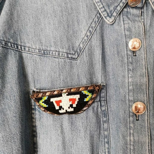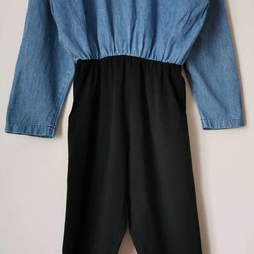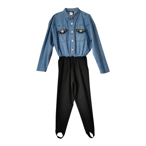 Combinaison 80’s Made in USA, chemise en jean ample et bas fuseau élastique sous le pied. Taille élastiquée. 2 poches sur la poitrine avec aigles en perles amovibles par velcro, 2 poches. Le mannequin fait une taille 40.