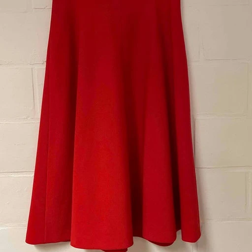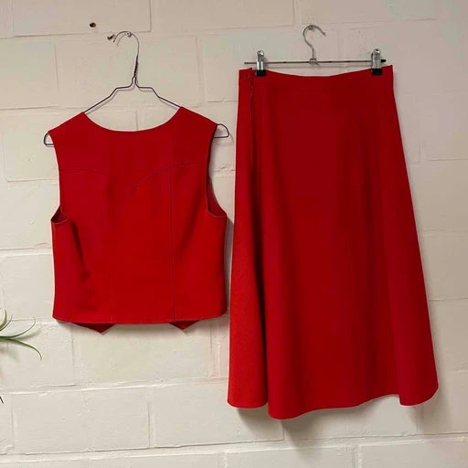 Ensemble 70’s jupe plissée et gilet rouge boutonnée matière épaisse et lainée, le gilet est cintrée, les deux pièces vienne se chevaucher l’une sur l’autre, attention poitrine bonnet c/d.