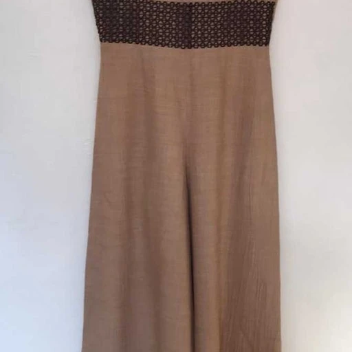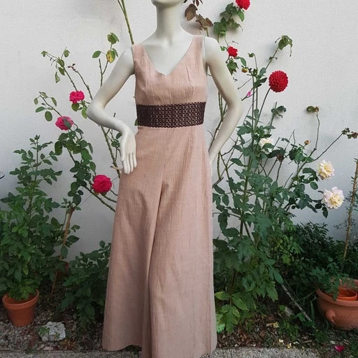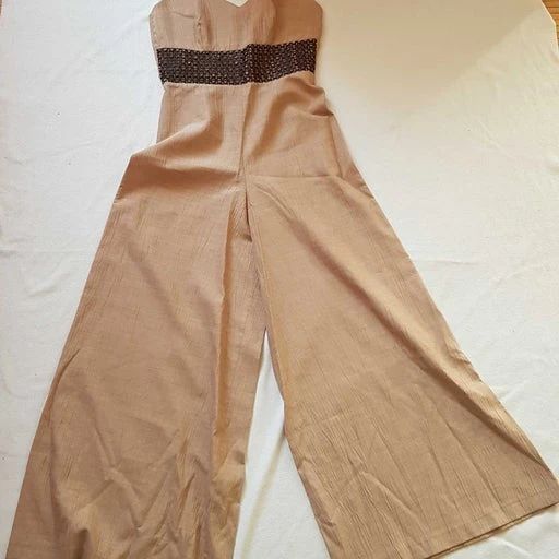 Le combipantalon a des jambes larges, avec grande fermeture éclair à l’arrière, avec détail en simili cuir devant, le tissu est un mélange de lin, des années 90s.