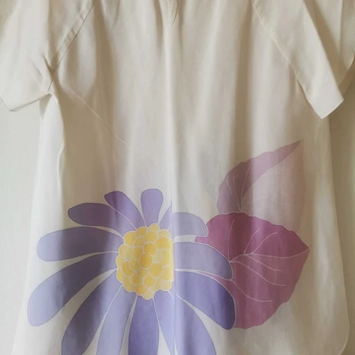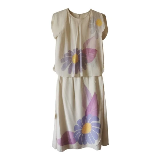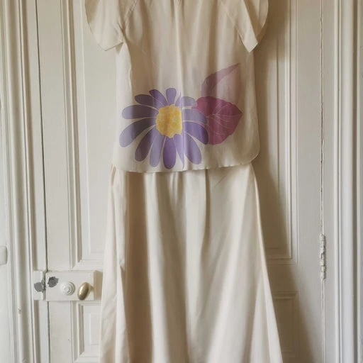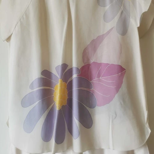 Ensemble en soie peint à la main, jupe portefeuille avec doublure froncée à la taille et blouse 47 cm sous aisselles avec épaules découvertes et bouton à l’arrière, fente arrondie sur les côtés.
