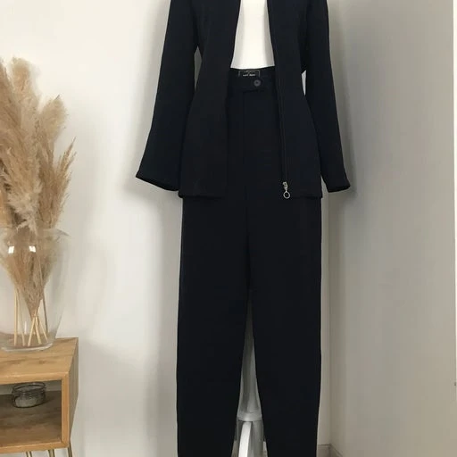 Ensemble tailleur veste pantalon bleu nuit, veste ceinturé et zippee, pantalon taille haute.