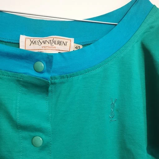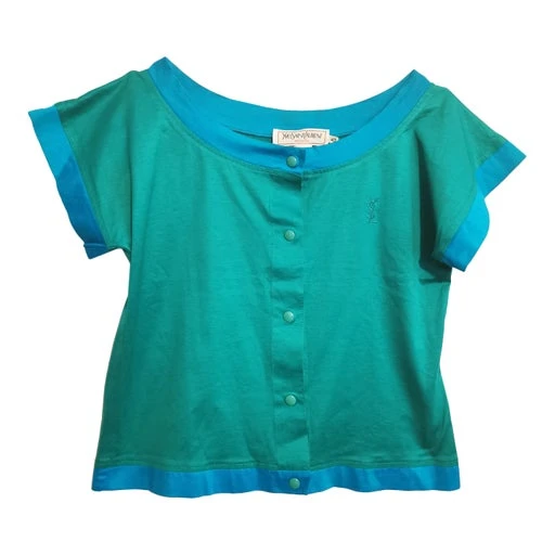 Chemisier encolure danseuse et boutonné devant, YSL brodé sur la poitrine.