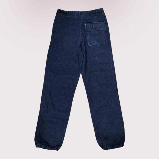 Jean bleu brut coupe baggy / cargo des années 90s. Écriture chinoise blanche, style années 2000.