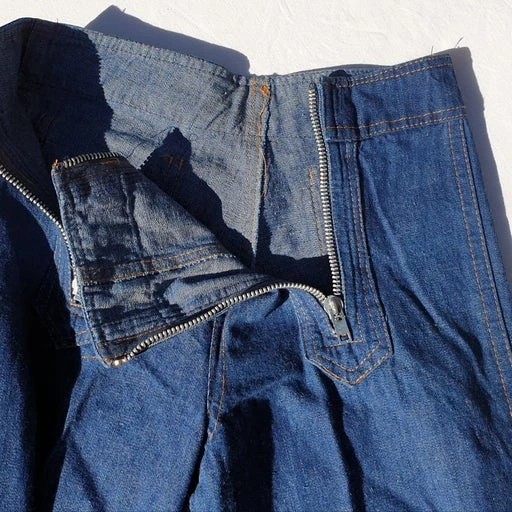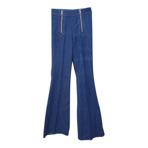 Jean flare souple en coton, double zip sur le devant, 2 poches derrière, monté sur ceinture, sans passant. Stock Rétro Neuf.