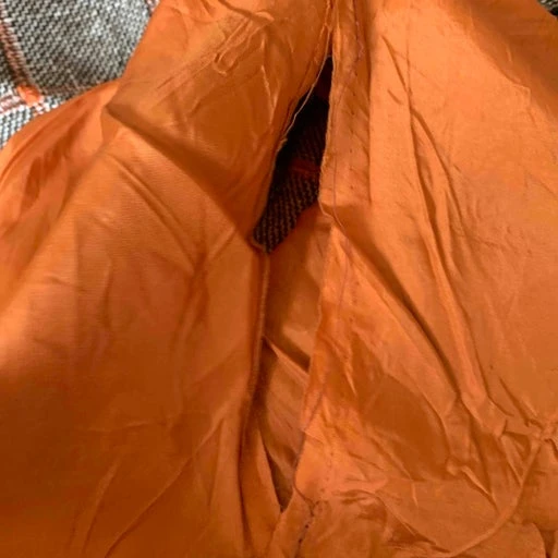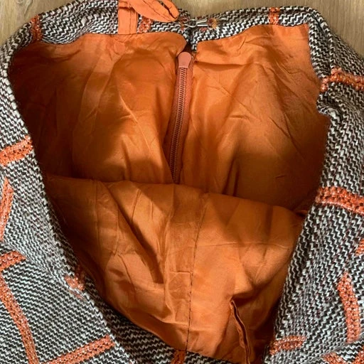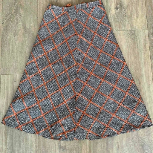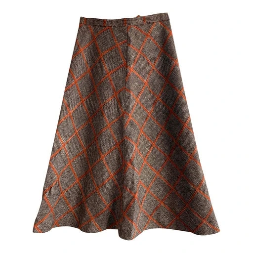 Jupe midi à losanges oranges, taille haute, contient de la laine.