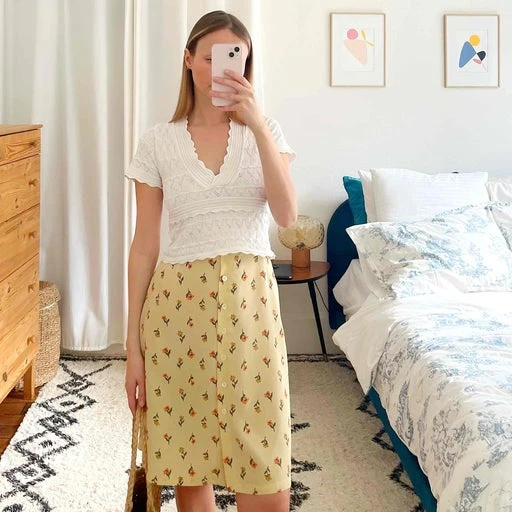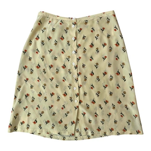 Jupe en soie, boutonnée sur le devant, tissu fluide et légère de couleur jaune poussin/beige imprimé de fleurs, longueur genoux. Ajustée sur la photo car portée par une T36