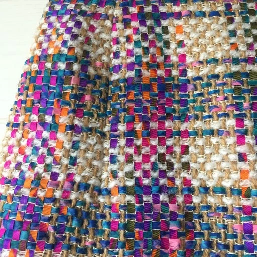 Jupe midi taille haute forme trapèze en tweed beige avec des rubans multicolores entrecroisés. Cousue main, pour une taille très fine. Pièce unique vintage des années 70’s, une pièce essentielle du vestiaire de mi-saison.