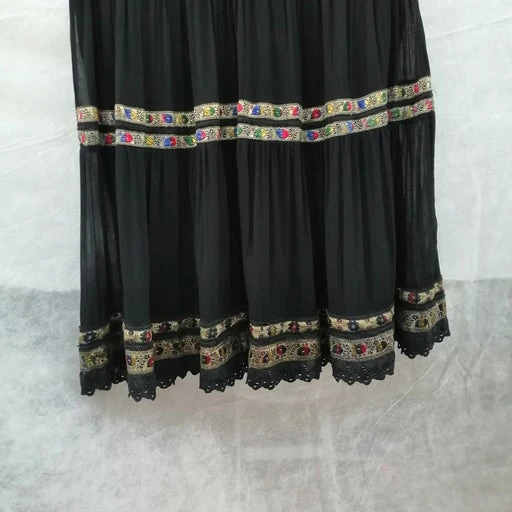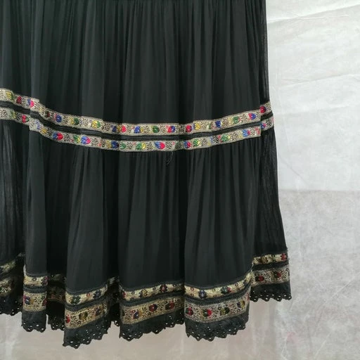 Jupe année 1998, style floklorique, noire doublée, en voile, les panneaux sont froncés et séparés par un galon avec motifs de différentes couleurs retrouvés au bas de la jupe. Finition galon en broderie anglaise. Jupe très légère, la ceinture à la taille est légèrement froncée avec un lien qu’on serre à sa convenance.