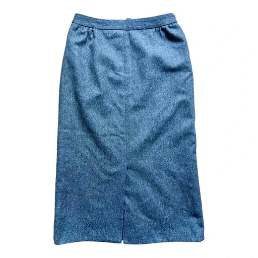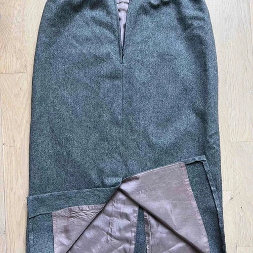 Jupe droite longue genoux flanelle grise (laine et polyester mélangé année 1980). 70% laine. Doublure en polyester rose pâle fendue avant et arrière sur 22 et 20 cm pour l’avant. Marque Lasserre. Fabrication française.