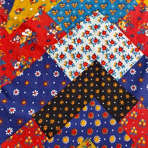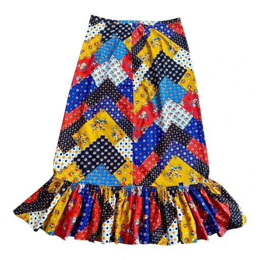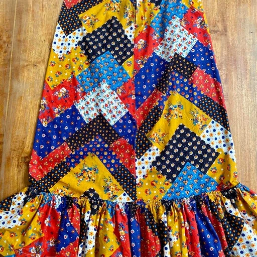 Jupe longue en coton, provençale en tissu imprimé patchwork. Pièce unique faite main années 70. Volant froncé au bas de 4 mètres de tissu. Tissu fin, léger et non doublé. Au dos, fermeture éclair, une pression et un crochet.