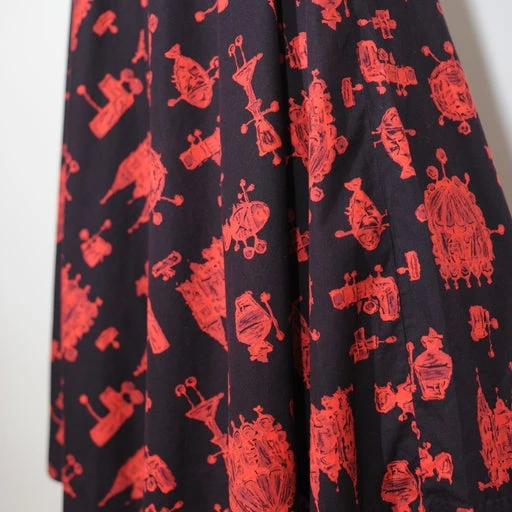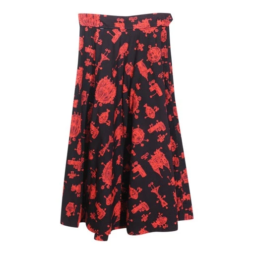 Jupe taille haute évasée, en coton, à motifs, rouge et noire vintage 60s.