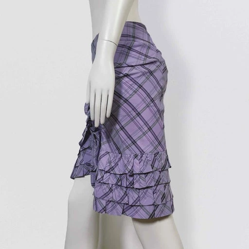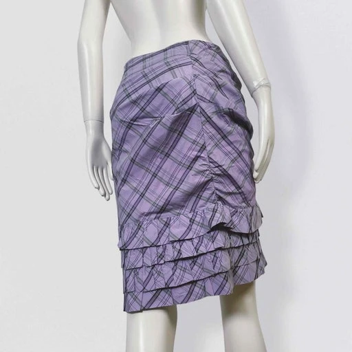 Superbe jupe sirène moulante violette claire à volants et fronces par la marque française UNGARO FEVER (Petite soeur d’ Emmanuel Ungaro). La jupe a une coupe super flatteuse avec ses jeux de fronces et de volants qui soulignent les courbes. La couleur de la jupe est superbe avec sa base violet clair et ses carreaux qui mélangent violet foncé et vert. Elle est légèrement asymétrique à la taille et sur le bas. Il y a une fermeture éclair d’un côté. La jupe est doublée. Une très belle pièce parfaite pour le printemps et l’été !