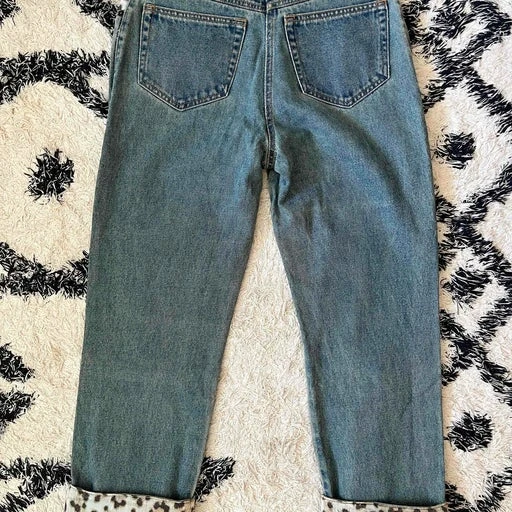 Pantacourt en jean, détails en tissu léopard, middle waist, poches devant et derrière, un bouton et fermeture éclair. Porté ici sur une T36 pour 1m64.