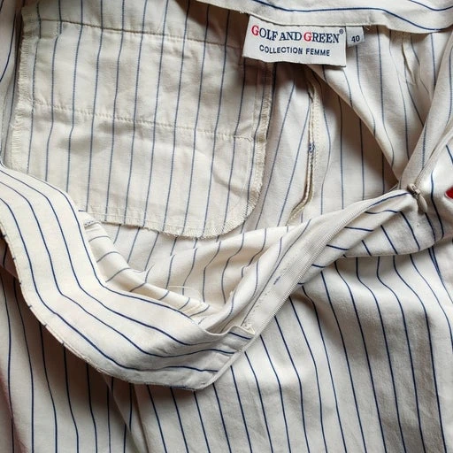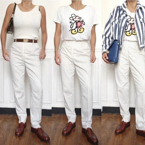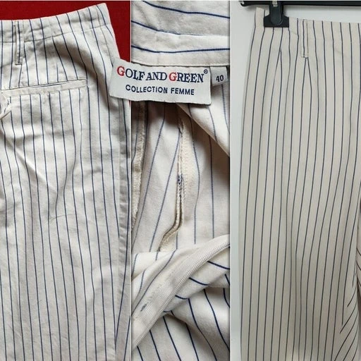 Pantalon cigarette à rayures. En coton. Couleur blanc cassé et bleu. Taille haute. Zip sur le coté. Made in France. Très bien conservé.