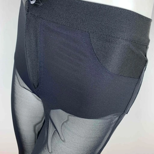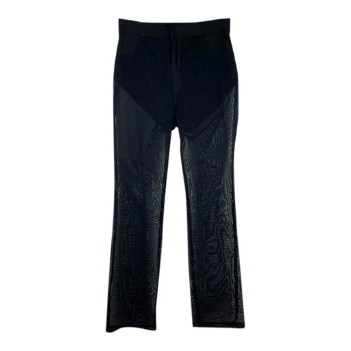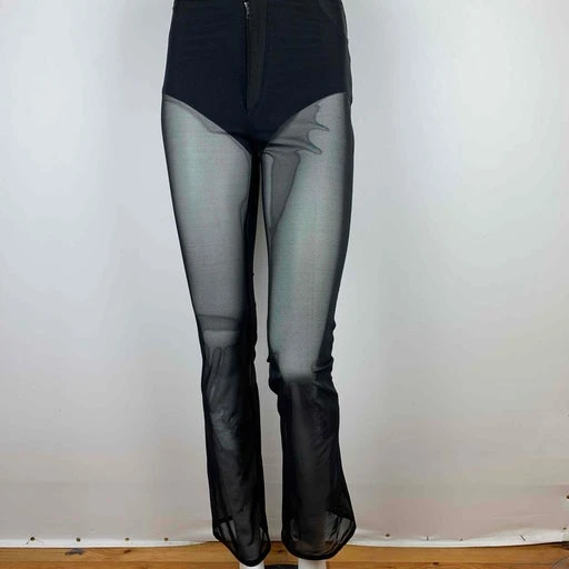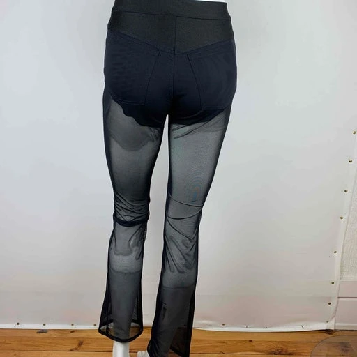 Pantalon droit en mesh noir transparent avec petit shorty noir des années 90-00. Style Y2K. 2 poches plaquées à l’arrière. Matière extensible à la taille. Coupe droite et taille haute.