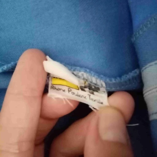 Pantalon flare De la marque Rhône Poulenc. Bleu avec surpiqûres orange.