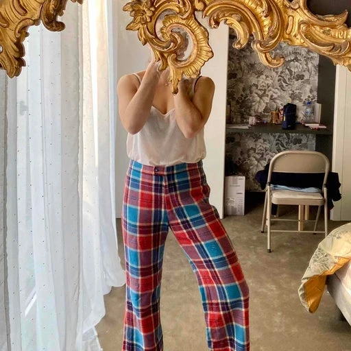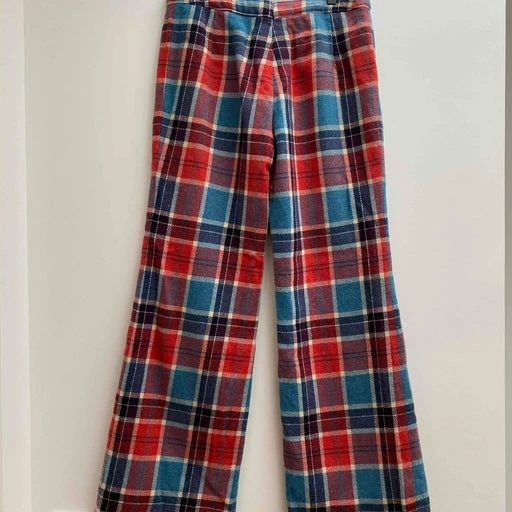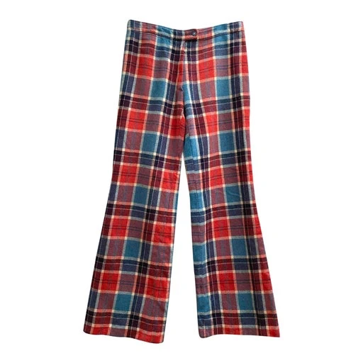 Pantalon flare en tartan de la marque Fusalp. Fabriqué en France. Très belle qualité. Bleu ciel, blanc et rouge.