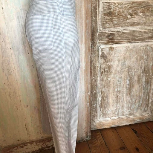 Pantalon taille haute carreaux vichy bleu ciel et blanc, petites ouvertures au niveau des chevilles