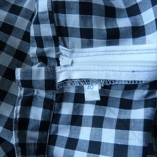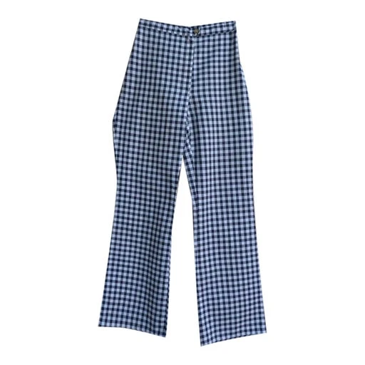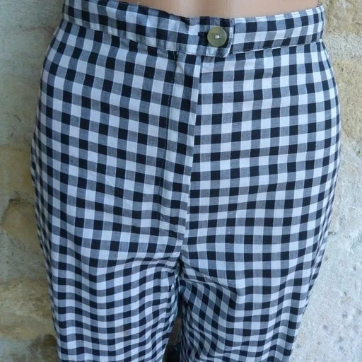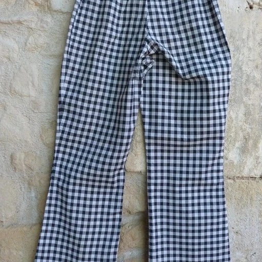 Pantalon flare taille haute, matière coton léger, motif vichy noir et blanc, noté taille 40 mais plus taille 32/34 actuelle, fermeture éclair et un bouton décalé.