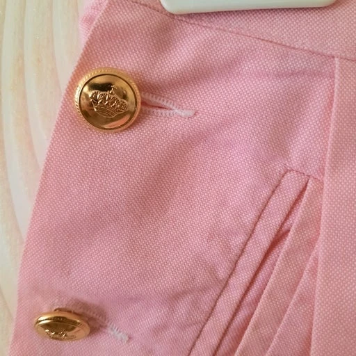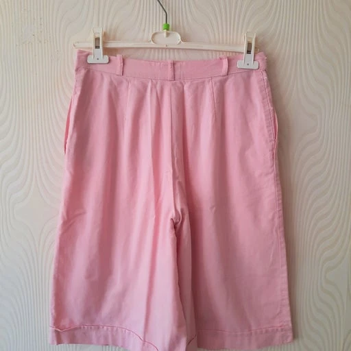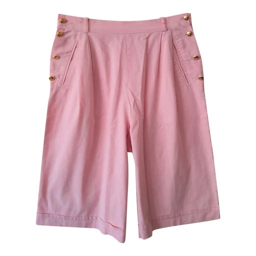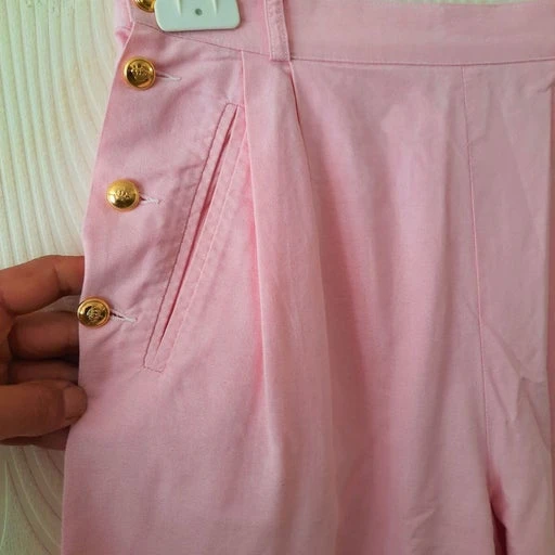 Short taille haute à pont rose pastel en coton, 80s. Taille haute à passants. Fermé par boutons bijoux dorés sur les côtés. 2 poches latérales. Revers au bas. Petit imprimé vichy blanc et rose pastel. 100% coton. Made in France 80s.