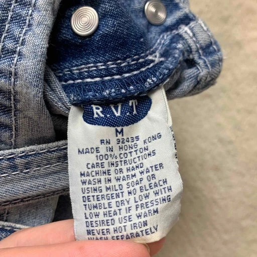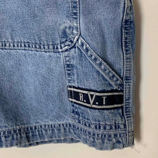 Salopette-short 90’s en jean de la marque R.V.T. Elle comporte de nombreuses poches avec son style charpentier. Le logo est brodé à deux reprises sur le devant et le derrière. Elle est plutôt fine et légère, donc idéale pour l’été!