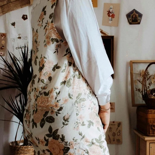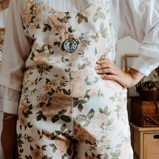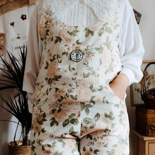 Salopette pastel, deux poches, boutons aux épaules, motif fleuri, poche ventrale avec écusson, en coton.