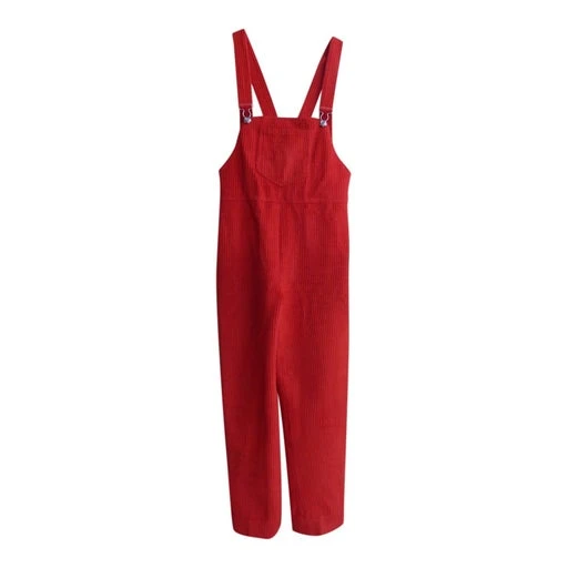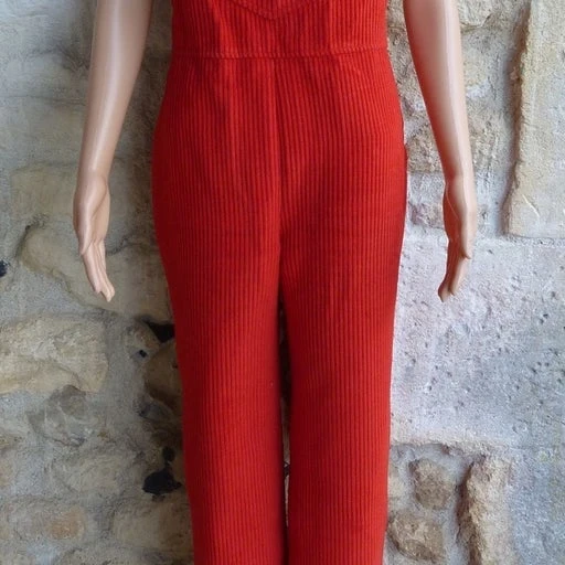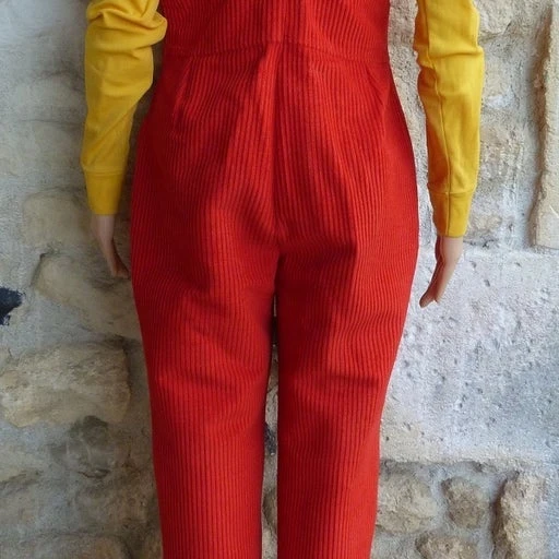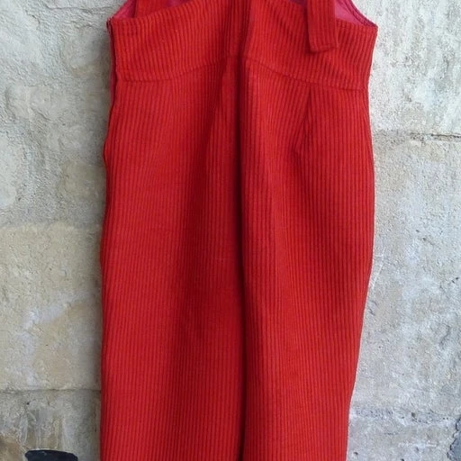 Salopette 70’s, velours côtelé, laine/élasthanne mélangé, couleur rouge, bretelles réglables, coupe droite, hanches larges, une poche avant le niveau poitrine, fermeture éclair sur le côté gauche.