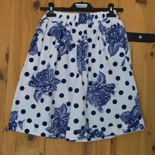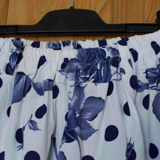 Short à pois et fleurs . Pièce des années 80. Blanc et bleu. Revers du tissu sur le bas . Made in France. Taille élastique pouvant s’étendre à 34cm