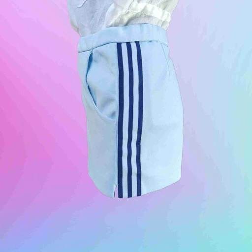 Short Adidas 80’s vintage. Bleu clair et bordés d’une bande bleu marine, poches côtés et fermeture éclair résistante. Des matériaux de qualité et des coutures durables. Made in France.