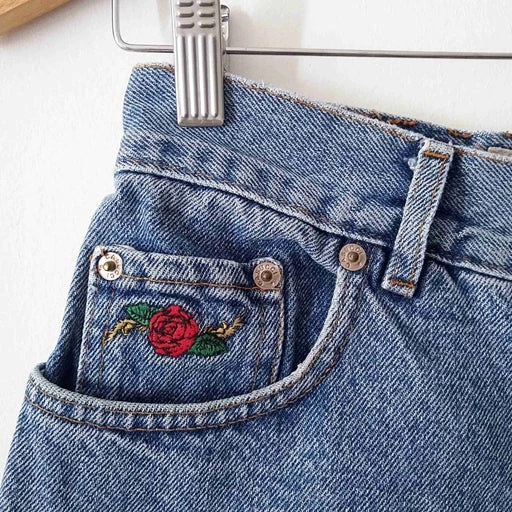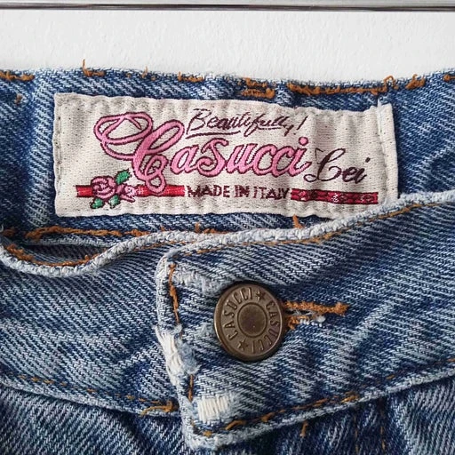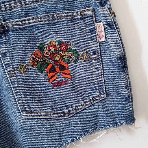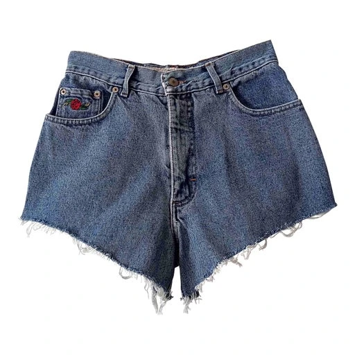 Short en jean à taille haute. Broderies sur les poches devant et derrière. Fabrication italienne.
