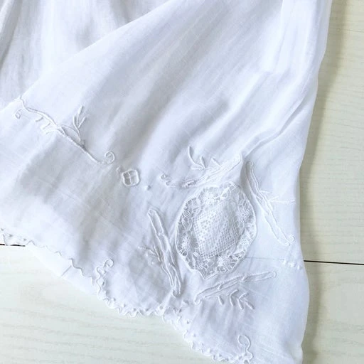 Short en voile de coton à broderies réalisée à la main, taille haute à régler avec un cordon et jambe large. Tissu fin translucide. Une pièce unique des années 20, à porter de jour comme de nuit.