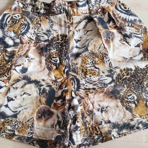 Mini short Kenzo, à motifs wild représentant des têtes de tigre, léopard, puma, lion. 2 poches, taille haute.