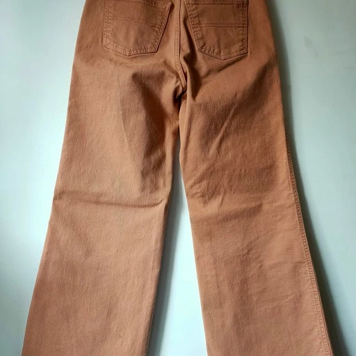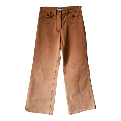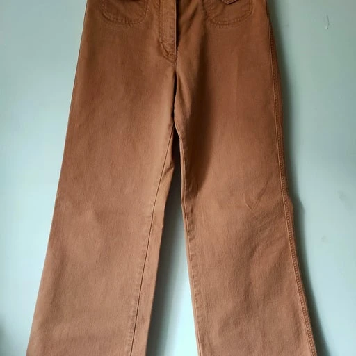 Pantalon flare Sonia Rynkiel, couleur saumon, avec deux poches à rabat devant, boutons siglés. Une pièce des années 90.