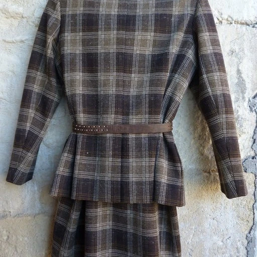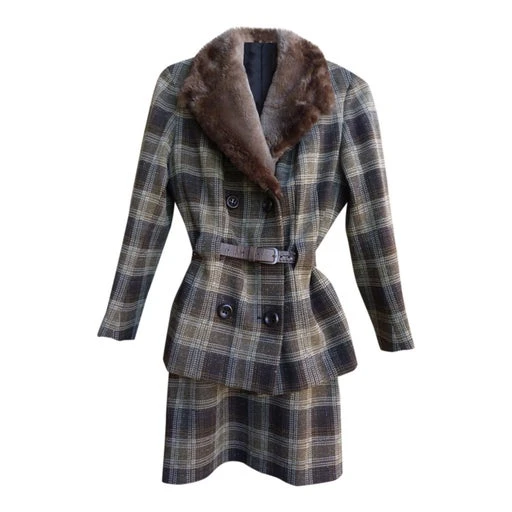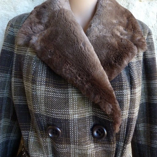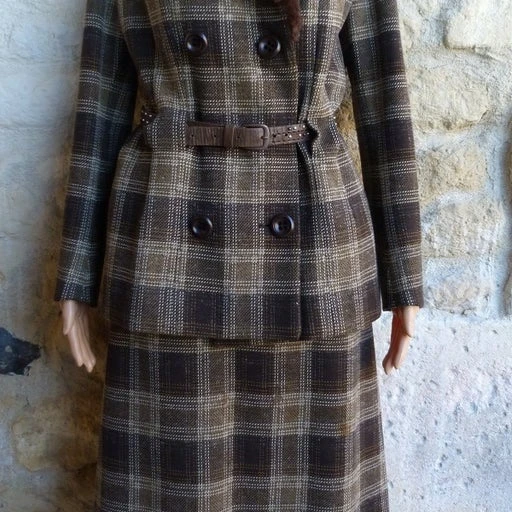 Tailleur jupe 60s – matière laine – motifs écossais marron beige – col fourrure lapin – veste et jupe doublure satiné – passant ceinture devant avec une ceinture fournis – épaulettes intégrées – fermeture par boutons d’origines + une petit bouton pression pour le maintient du col