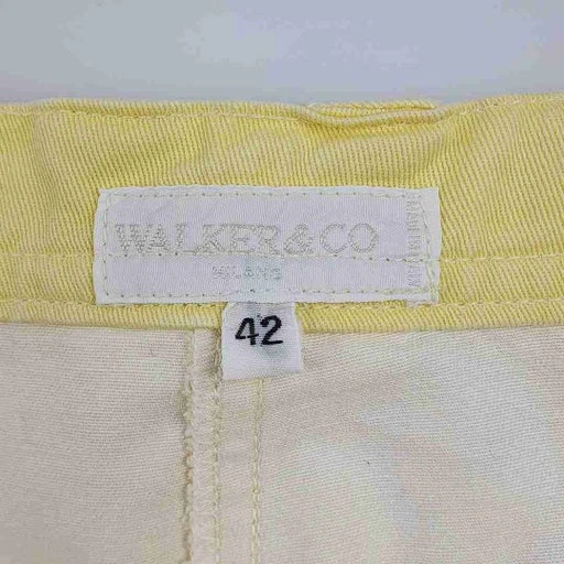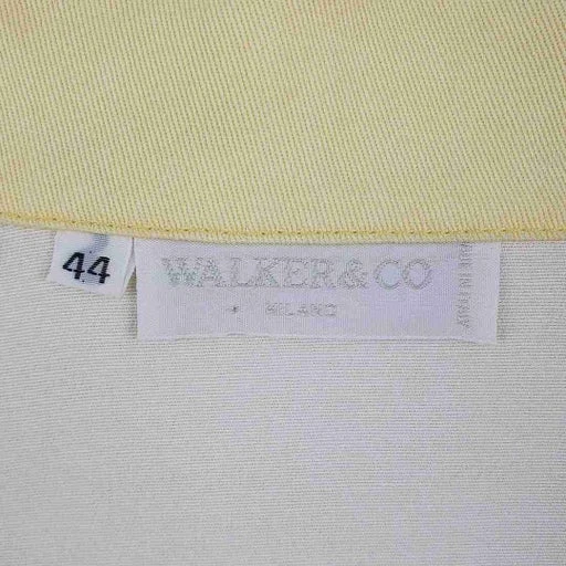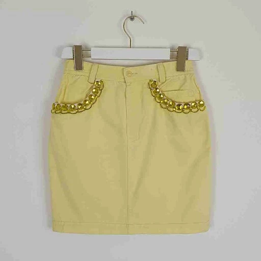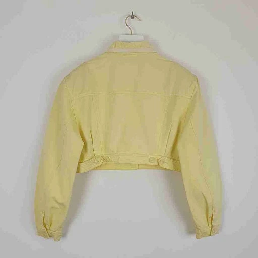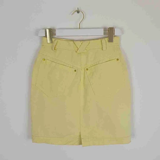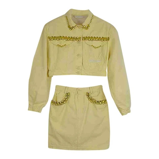 Tailleur jupe en jean jaune pastel, veste à épaulettes, manches bouffantes & jupe taille haute en jean jaune pastel, strass & perles vintage.