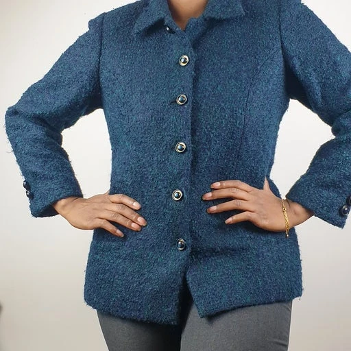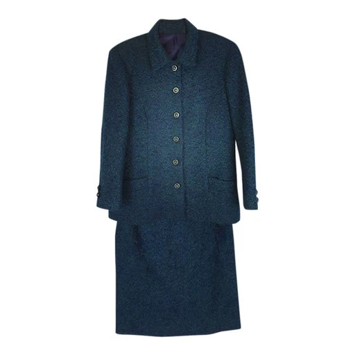 Un tailleur venu tout droit des années 60’s. Une veste et une jupe couleur vert foncé, une coupe droite.