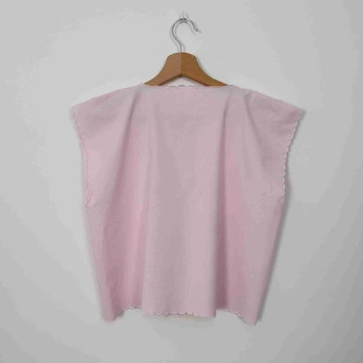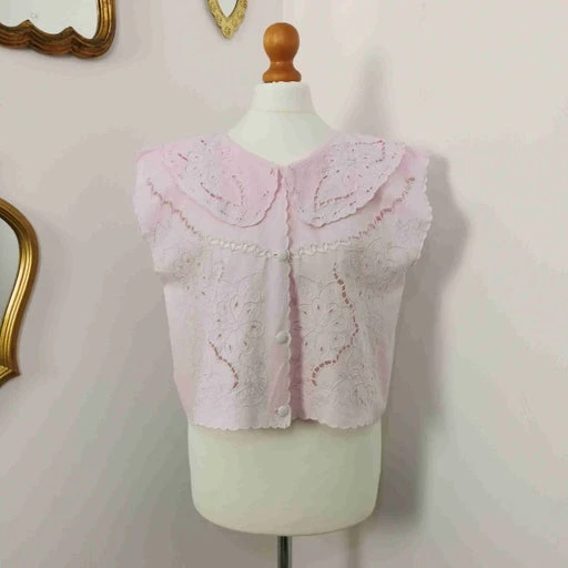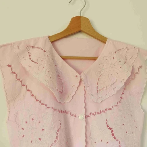 Top en coton ancien brodé rose pâle. Coupe courte et ample, grand col claudine brodé, broderie ajouré à l’avant, bordures festonnées. Pièce confectionnée et brodée main.
