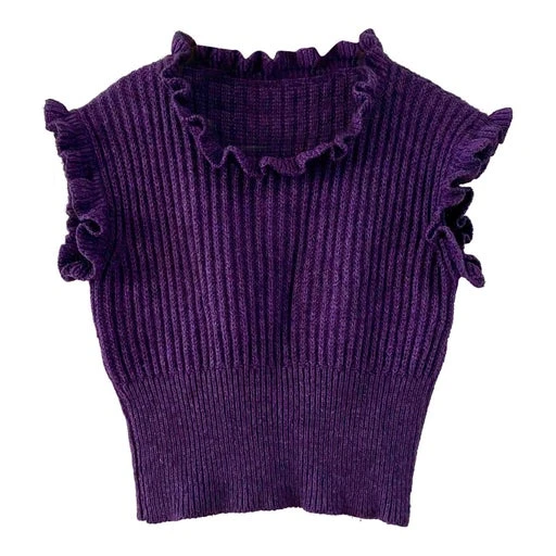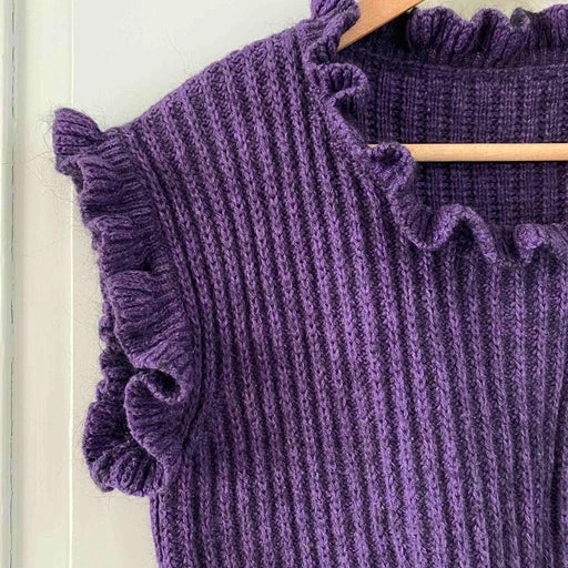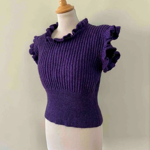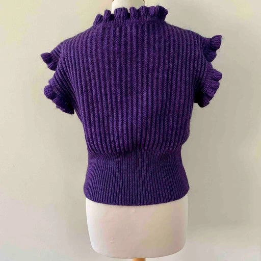 Top en laine et mohair violet, col et manches volantées, forme cropped resserrée taille, fabriqué en Italie, taille 36 porté ici sur un mannequin T36.