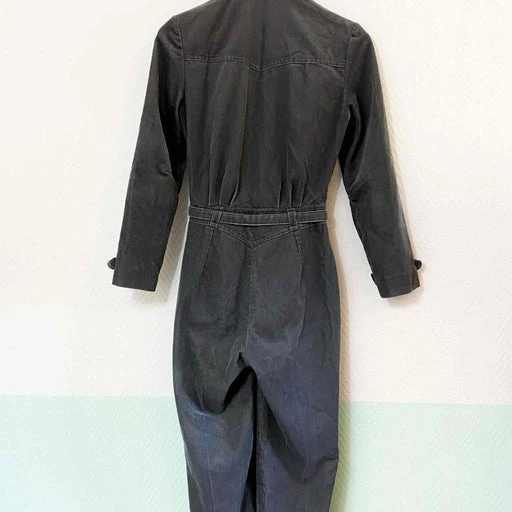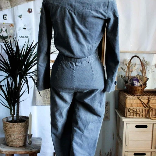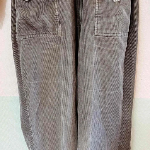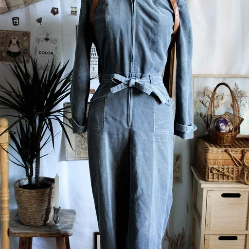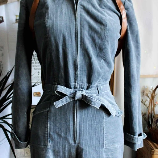 Très bon état. Combinaison pantalon grise, en velours côtelé. Elastique à la taille, zip pour fermer, deux poches sur les cotés, nœud à la taille. Combi pantalon des années 90.